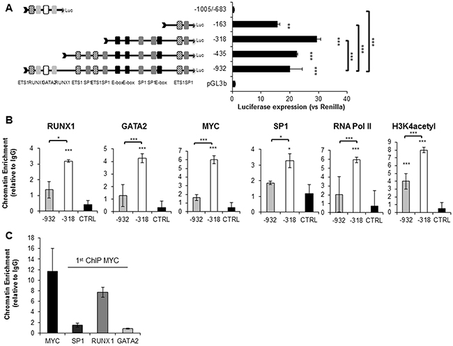 Figure 2: RUNX1, GATA2, SP1, MYC and RNA Pol II co-localize on the SET minimal functional promoter region (-318bp-TSS). Luciferase assays with the SET promoter constructs in HL-60 cells 48h after transfection. A. Results represent relative Firefly/Renilla luciferase activities considering the empty pGL3basic vector as 1. Data are the means ± SD of three independent experiments. Asterisks denote the statistical significance of the differences between pGL3b and the constructs or between the paired constructs where indicated. *P < 0.05, **P < 0.01, ***P < 0.001, Two-way ANOVA and Bonferroni tests were used. B. Chromatin Immunoprecipitation assay performed in the HL-60 cell line. Two promoter sub-regions were defined, a distal region (-932/-587bp) enriched with RUNX1 and GATA2 predicted binding sites and the minimal functional promoter region (-318/-144bp) with SP1 and MYC E-box putative binding sites. A distal genomic region on the same chromosome 9 was used as a negative control. QRT–PCR results were calculated using the 2-Ct method and they are presented as the fold enrichment of chromatin DNA precipitated by the specific antibody versus chromatin DNA precipitated by a non-related IgG. Values are the mean of three independent experiments. Asterisks denote the statistical significance differences where indicated. *P < 0.05, **P < 0.01, ***P < 0.001, Two-way ANOVA and Bonferroni tests were used. C. ChIP-re-ChIP assay performed in the HL-60 cell line. Technical procedures were carried out as described in Materials and Methods. MYC antibody was used for the first immunoprecipitation, and SP1, RUNX1, and GATA2 antibodies were used for the second immunoprecipitation. Re-ChIP assay values are the mean of two independent experiments.