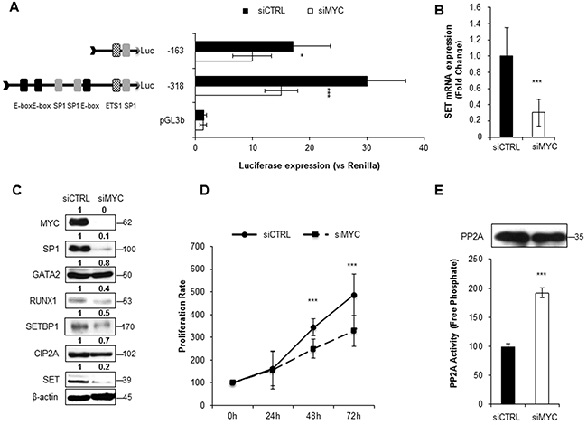 Figure 3: MYC depletion significantly reduces SET transcription and re-activates PP2A in AML. A. Luciferase assay in HL-60 cells transfected with a siRNA for MYC silencing. B. SET mRNA expression assessed by QRT-PCR. C. Western blot analysis of the corresponding protein levels of MYC, SP1, GATA2, RUNX1, SETBP1, CIP2A and SET. β-Actin detection was used as loading control. Numbers indicate the protein quantification relative to β-Actin and assessed using Image J software (NIH, USA). D. Cell proliferation rates. E. PP2A activity levels with paired western blot results of the amount of PP2A immunoprecipitated in each condition. Data are the means ± SD of three independent experiments. *P < 0.05, **P < 0.01, ***P < 0.001, Students t-test analysis.
