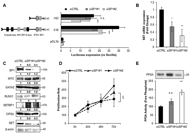 Figure 4: SP1 activates SET transcription in AML. A. Luciferase assay in HL-60 cells transfected with two different siRNAs, siRNA#1 and siRNA#2. B. SET mRNA expression assessed by QRT-PCR. C. Western blot analysis of the corresponding protein levels of SP1, MYC, GATA2, RUNX1, SETBP1, CIP2A and SET. β-Actin was used as loading control. Numbers indicate the protein quantification relative to β-Actin and assessed using Image J software (NIH, USA). D. Cell proliferation rates. E. PP2A activity levels with paired western blot results of the amount of PP2A immunoprecipitated in each condition. Values are the mean ± SD of three independent experiments. *P < 0.05, **P < 0.01, ***P < 0.001, Students t-test analysis.