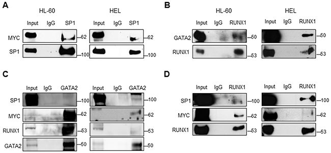 Figure 5: Transcriptional regulation complex that activates SET expression in AML. Immunoprecipitation experiments in the HL-60 (left) and HEL (right) cell lines were performed using anti-SP1 or non-specific IgGs (used as a control). Then, the immunoprecipitates were analyzed for the presence of SP1 and MYC. A. Immunoprecipitation experiment using anti-RUNX1 followed by the analysis for the presence of RUNX1 and GATA2. B. Immunoprecipitation experiment using anti-GATA2 followed by the analysis for the presence of SP1, MYC, RUNX1 and GATA2. C. Immunoprecipitation experiment using anti-RUNX1 followed by the analysis for the presence of SP1, MYC and RUNX1. D. Input represents 30mg of total lysate. The western blots here displayed are the representation of three independent experiments.