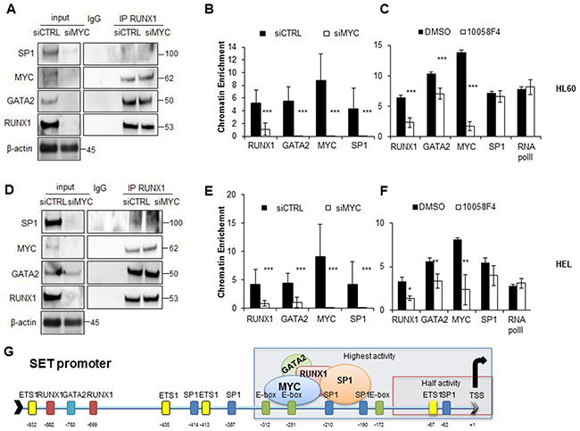 As the region of the SET promoter with maximum activity contains MYC binding sites, and these TFs interact among them, we studied whether depletion or inhibition of MYC could affect the formation and localization of the transcriptional complex of MYC, SP1, RUNX1 and GATA2. Co-IP and ChIP experiments in cells transfected with a siRNA for MYC show that the decrease of MYC, and consequentially reduction of RUNX1, GATA2 and SP1, did not totally prevent the formation of the multi-protein complex in the cells (Figure 7A, 7D). However, its localization on the SET functional promoter was entirely abolished (Figure 7B, 7E). Similar results were obtained in AML cell lines treated with the MYC inhibitor 10058F4. The inhibition and consequent reduction of MYC significantly reduced RUNX1 and GATA2 recruitment on the SET functional promoter (by 2.7 and 1.5 times p < 0.001, respectively in HL-60 cells (Figure 7C); and by 2.39 and 1.68 times p < 0.001 in the HEL cell line, (Figure 7F), whereas no substantial differences were found relative to SP1 or RNA pol II binding.