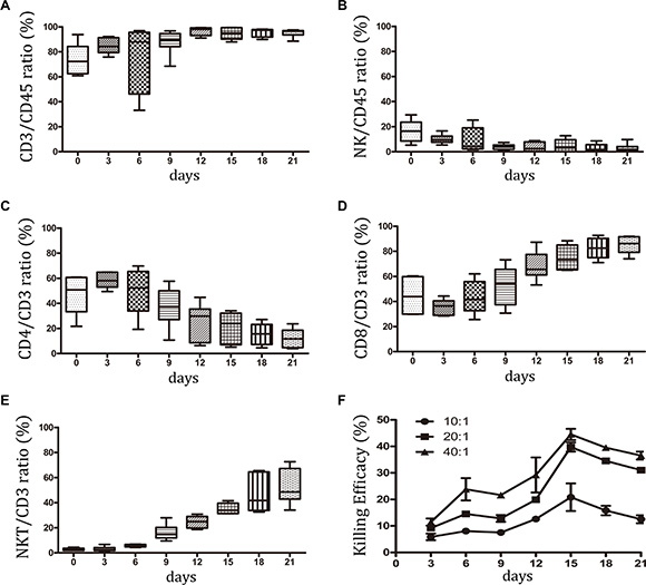 Figure 1: Subsets of CIK cells were detected in small-scale culture system. PBMCs from six patients with NCSLS were selected for small-scale CIK culture. During 21 days of incubation, the subsets of CIK cells were studied by FCM analysis. (A–B) The dynamic percentage of CD3+ and CD3-CD56+ NK cells in CD45+ lymphocyte were shown. (C–E) Among the CD3+ cells, the percentage of CD3+CD4+ T, CD3+CD8+ T, CD3+CD56+ NKT cells were detected during the culture. (F) The dynamic assay of CIK cytotoxic activity on A549 cell line was performed at three effector-to-target cell ratios of 40:1, 20:1, 10:1. Data represent the mean ± SD of six independent experiments.