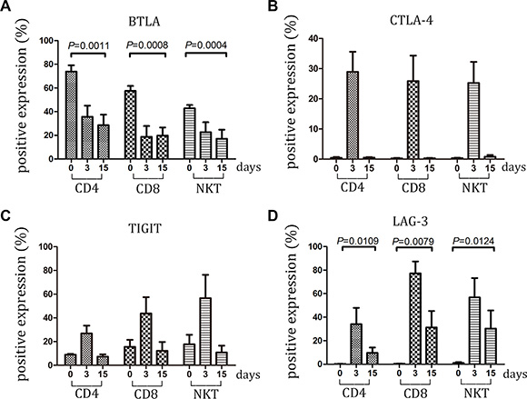 Figure 6: Expression of BTLA, CTLA-4, TIGIT and LAG-3 within large-scale culture system was detected. (A–D) Expression of BTLA, CTLA-4, TIGIT and LAG-3 on CD3 + CD4 + T, CD3 + CD8 + T and CD3 + CD56 + NKT cells was detected at day 0, 3 and 15 by FCM. Data represent the mean ± SD of ten independent experiments