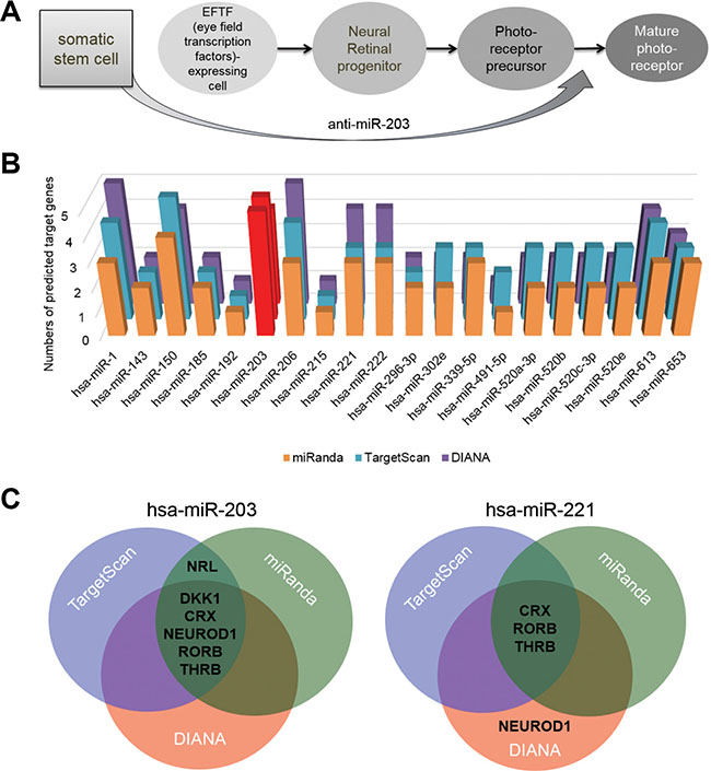 Figure 1: miR-203 targets retina development-relevant genes. (A) A schematic of the neural retina differentiation of ES cells into mature PRs with markers that indicate intermediate developmental steps. The hypothesis of retina differentiation from somatic stem cells directly by treatments of anti-miR-203 was shown. (B) The number of predicted targets for the most prominent 20 miRNAs were measured by using the target prediction program miRanda. Targets were selected among seven representative retina development-relevant genes (C) Predicted target genes of both candidate miRNA, miR-150 and miR-203, were illustrated as a Venn diagram. The overlapping area of the Venn diagram represents putative targets predicted by three different miRNA target prediction programs.
