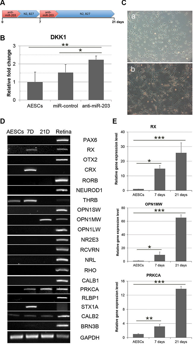 Figure 2: miR-203 inhibition induces the initial differentiation of AESCs into neural retina. (A) A schematic of anti-miR-203 treatment during the retina differentiation of AESCs for 21 days. (B) A quantitative RT-PCR analysis shows the relative gene expression level of DKK1 at 3 days after the transfection of anti-miR-203. (C) Phase-contrast images of AESCs during anti-miR-203-mediated differentiation as shown at the day 0 (a) and days 21 (b). (D) A RT-PCR analysis shows the change in the retina-specific gene expression pattern after 7 days (7D) and 21 days (21D) of differentiation compared to normal human retina tissue (Retina). (E) The gene expression level of RX, OPN1MW and PRKCA during the initial differentiation as assessed by a quantitative RT-PCR analysis. *P < 0.05; **P < 0.01.