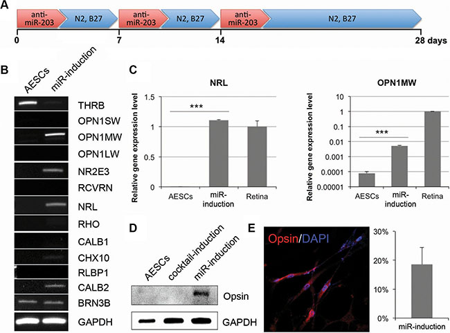 Figure 3: The long-term treatment of anti-miR-203 can induce retina maturation of AESCs. (A) A differentiation scheme of successive treatments of anti-miR-203 shows the neural retina differentiation of AESCs over the course of 28 days. (B) A RT-PCR analysis shows the retina-specific gene expression pattern in AESCs and the miRNA-induced PR-like cells. (C) A quantitative RT-PCR analysis shows the relative gene expression level of OPN1MW and NRL compared to human retina tissue (Retina). (D) A western blot analysis shows the expression of Opsin in the PR-like cells, differentiated by cocktail or anti-miR-203. (E) The miR-induced PR-like cells expressed Opsin as shown by immunocytochemistry. The frequencies of expression are shown. Cell nuclei are stained with DAPI.