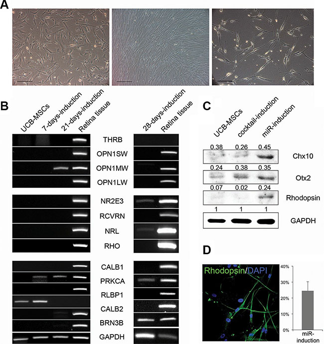 Figure 4: UCB-MSCs can also give rise to neural retina subtypes. (A) Phase-contrast images of UCB-MSCs during the retina differentiation are shown at the day 0 (left), 7 (middle) and 28 (right). (B) A RT-PCR analysis shows the retina-specific gene expression pattern during the initial differentiation and the retina maturation compared to human retina tissue. (C) A western blot analysis indicates the expression of Chx10, Otx2 and Rhodopsin in UCB-MSCs and the cocktail-induced and miRNA-induced PR-like cells. (D) The miRNA-induced PR-like cells expressed Rhodopsin as shown by immunocytochemistry. The frequencies of expression are shown. Cell nuclei are stained with DAPI.