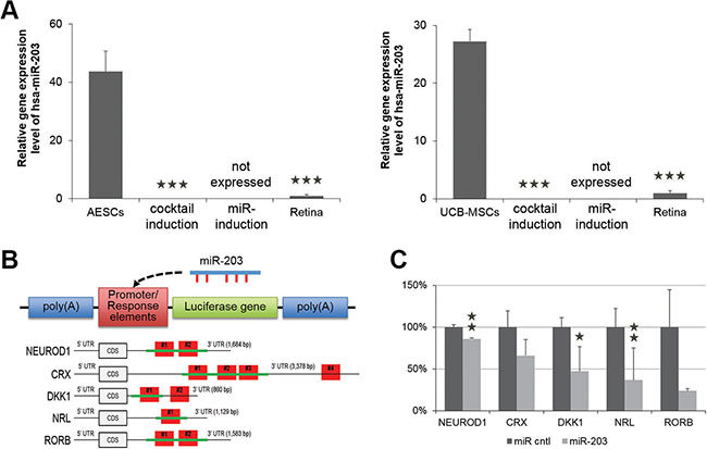 Figure 5: miR-203 directly targets genes involved in neural retina development. (A) A quantitative RT-PCR shows the relative expression level of miR-203 in somatic stem cells that were undifferentiated, differentiated by a neural retina-specific cocktail of exogenous factors (DKK1) or differentiated by anti-miR-203 compared to human retina tissue (Retina). (B) Schematics of the reporter constructs of pmirGLO Dual-Luciferase vector. Response elements consist of the cloned sequence (green lines) from 3′UTR of predicted target genes including one or multiple binding sites (red boxes). This reporter construct could be targeted by miR-203. (C) The relative luciferase activity in 293T cells expressed as the fold change of Firefly to Renilla after miR-203 treatment. These ratios were normalized to the value of each reporter construct. *P < 0.05; **P < 0.01.