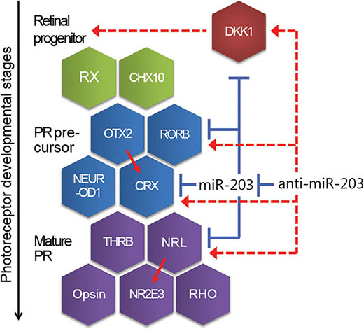 Figure 6: A schematic showing the developmental steps and genes relevant for neural retina development. Mature miR-203 is involved in neural retina differentiation as a repressor of genes, such as DKK1, CRX and NRL. Conversely, Anti-miR-203 up-regulates those target genes through inhibiting of miR-203. Red line, promoting. Blue line, inhibiting. Dotted line, indirect regulating.