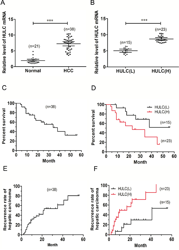 Figure 1: Relative HULC expression in HCC tissues and its relationship with overall survival of HCC patients. A. Relative expression of HULC in HCC tissues (n=38) compared with that of corresponding normal tissues (n=21). HULC expression as determined using qRT-PCR and normalized to GAPDH expression. B. HULC expression was classified into two groups HULC(L) and HULC(H). Kaplan-Meier survival curves and log-rank tests were used to evaluate survival in all patients C. and each of the two sub-groups (L versus H HULC) patients D. Kaplan-Meier survival curves and log-rank tests were used to evaluate recurrence rates in all patients E. and each of the two sub-groups of patients F. Values shown indicate mean ± 95% CI. ***P< 0.001.