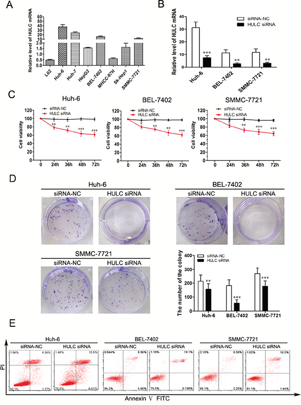 Figure 2: Effect of HULC on HCC cell growth in vitro. A. Analysis of HULC expression levels in HCC cell lines (Huh-6, Huh-7, HepG2, BEL-7402, MHCC-97H, Sk-Hep1 and SMMC-7721) compared with L02 cell as determined using qRT-PCR and normalized to GAPDH expression. B. Relative expression levels of HULC in Huh-6, BEL-7402 and SMMC-7721 cells transfected with siRNA-NC or HULC siRNA, as determined using qRT-PCR. C. CCK8 was performed to determine cell viability and proliferation of Huh-6, BEL-7402 and SMMC-7721 cells. D. Representative results of colony formation of Huh-6, BEL-7402 and SMMC-7721 cells transfected with siRNA-NC or HULC siRNA. E. Huh-6, BEL-7402 and SMMC-7721 cells were stained and analyzed by flow cytometry after transfection for 24 hours. Values shown indicate mean ± SD. *P < 0.05, **P < 0.01, ***P < 0.001.