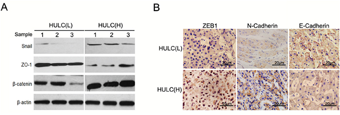 Figure 4: HULC was associated with EMT features of HCC. A. Western blot was used to detect expression of Snail, ZO-1and β-catenin in HULC(L) and HULC(H) groups as normalized to β-actin expression. B. Immunohistochemisty revealed expression of ZEB1 in the cytoplasm and nucleus of HCC cells. Expression of N-Cadherin and E-Cadherin in the plasmalemma and cytoplasm of HCC cells (magnification, 200×, scale bars=20 μm).