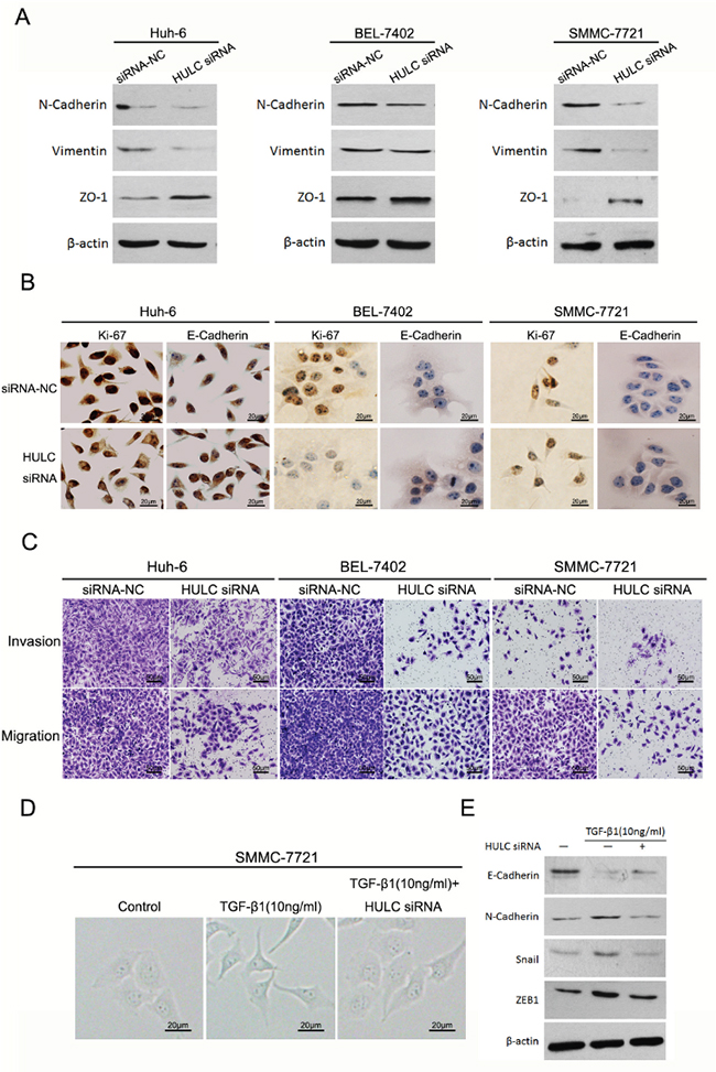Figure 5: HULC promoted epithelial to mesenchymal transition in vitro. A. Western blot was used to measure expression levels of EMT markers (N-Cadherin, Vimentin and ZO-1) in Huh-6, BEL-7402 and SMMC-7721 cells transfected with HULC siRNA or siRNA-NC, and normalized to β-actin expression. B. Expression levels and location of Ki-67 and E-Cadherin in Huh-6, BEL-7402 and SMMC-7721 transfected with siRNA-NC or HULC siRNA as determined using immunocytochemistry (magnification, 200×, scale bars=20 μm). C. The effect of decreasing HULC expression on cell invasion and migration of Huh-6, BEL-7402 and SMMC-7721 cells as assessed using a transwell assay (magnification, 100×, scale bars=50 μm). D. The effect of HULC on morphological differences in SMMC-7721 cells treated with TGF-β1 (magnification, 400×, scale bars=20 μm). E. Measures of expression levels of EMT markers (E-Cadherin, N-Cadherin, Snail and ZEB1) as determined using western blot in SMMC-7721 cells treated with TGF-β1 or transfected with HULC siRNA, and normalized to β-actin expression.