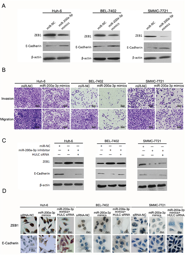 Figure 6: HULC enhanced epithelial to mesenchymal transition by sequestering miR-200a in HCC cells. A. Western blot was used to measure expression levels of ZEB1 and E-Cadherin in Huh-6, BEL-7402 and SMMC-7721 cells transfected with miR-200a-3p mimics or miR-NC, and normalized to β-actin expression. B. The effect of increasing miR-200a-3p expression in cell invasion and migration of Huh-6, BEL-7402 and SMMC-7721, transfected with miR-200a-3p mimics or miR-NC, as determined using a transwell assay (magnification, 100×, scale bars=50 μm). C. Expression levels of ZEB1 and E-Cadherin as determined using western blot in Huh-6, BEL-7402 and SMMC-7721 cells transfected with the miR-200a-3p inhibitor, miR-NC or HULC siRNA, and normalized to β-actin expression. D. Expression levels and location of ZEB1 and E-Cadherin as determined using immunocytochemistry in Huh-6, BEL-7402 and SMMC-7721 cells transfected with miR-200a-3p mimics, miR-NC or HULC siRNA (magnification, 400×, scale bars=20 μm).