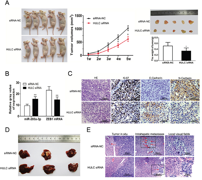 Figure 7: The impact of HULC on tumorigenesis and intrahepatic metastases in vivo. A. LV-siRNA-NC or LV-HULC siRNA was transfected into Huh-6 cells, which were injected into nude mice (n=5). Tumor volumes were calculated after injection at weekly intervals. B. QRT-PCR was performed to detect the average expression of miR-200a-3p and ZEB1 mRNA in xenograft tumors (n=5). C. Ttumor sections under H&E staining (magnification, 100×, scale bars=50 μm) and IHC staining (magnification, 200×, scale bars=20 μm) to detect Ki-67, E-Cadherin and N-Cadherin. D. and E. Representative images of intrahepatic metastases (red arrows) based on H&E staining (magnification, 100×/200×, scale bars=50/20 μm) in nude mice 5 weeks after liver injection with SMMC-7721 cells that were transfected with LV-siRNA-NC or LV-HULC siRNA. Values shown indicate means ±SD,*P < 0.05, **P < 0.01.