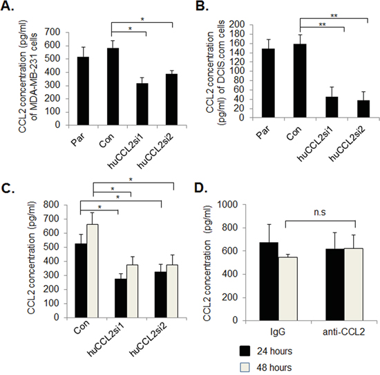 Figure 1: Ca-TAT peptides complexed to CCL2 siRNAs significantly reduce CCL2 protein expression in breast cancer cells. A. MDA-MB-231 or B. DCIS.com cells cultured in 2D were transfected with Ca-TAT peptides complexed to control (Con) or CCL2 siRNAs (huCCL2si1 or huCCL2si2). 48 hours post transfection, conditioned media was measured by CCL2 ELISA. Par= Parental. C-D. MDA-MB-231cells were cultured in 3D collagen, and were transfected with Ca-TAT peptides complexed to siRNAs (C) or treated with 10 μg/ml anti-CCL2 or IgG (D). CCL2 expression was measured in conditioned medium by ELISA, 24 hours and 48 hours post-treatment. Statistical analysis was performed by One way ANOVA followed by Bonferonni post-hoc analysis. Statistical significance was determined by p-value less than 0.05. *p<0.05, **p<0.01, n.s=not significant. Mean+SEM is shown.