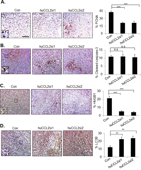 Figure 4: CCL2 gene silencing enhances necrosis and autophagy in MDA-MB-231 breast tumor xenografts. MDA-MB-231 breast tumor xenografts were injected with Ca-TAT peptides complexed to control siRNAs (Con), or CCL2 siRNAs (huCCL2si1 or huCCL2si2), and immunostained for expression of A. PCNA, B. Cleaved caspase-3, C. HMGB1, or D. LC3B. Scale=100 microns. Statistical analysis was performed by One Way ANOVA followed by Bonferonni post-hoc analysis. Statistical significance was determined by p-value less than 0.05. *p<0.05, ***p<0.001, n.s=not significant. Mean+SEM is shown. N=6 animals per group.