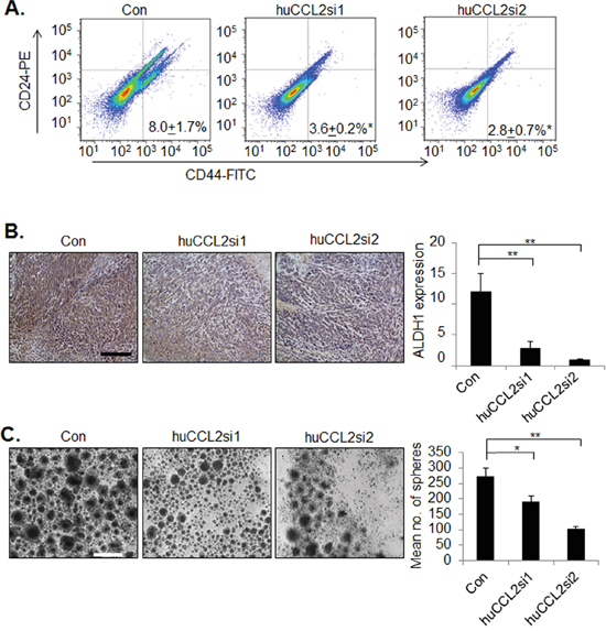 Figure 5: CCL2 gene silencing in breast cancer cells by Ca-TAT/siRNA complexes inhibits cancer stem cell renewal. A-B. MDA-MB-231 breast tumor xenografts (N=6 animals per group) were treated with control (Con) or Ca-TAT complexed to CCL2 siRNAs (huCCL2si1, huCCL2si2), and were analyzed for CD24 and CD44 expression by flow cytometry (A), or ALDH1 expression by immunohistochemistry stain (B). ALDH1 expression was quantified by Image J; arbitrary units are shown. Scale bar=100 microns. C. MDA-MB-231 cells in culture were transfected with Ca-TAT/siRNA complexes and examined for mammosphere formation. Representative images are shown at passage 4. Scale bar=200 microns. Statistical analysis was performed by One Way ANOVA followed by Bonferonni post-hoc comparisons with Control group. Statistical significance was determined by p-value less than 0.05. *p<0.05, **p<0.01. Mean+SEM is shown.