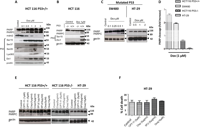 Figure 1: Characterization of WT, null, and mutated P53 CRC cell lines response to DNA damaging agents. A. HCT116 P53+/+ cells were treated with dose-increase of Dox for 24hr and checked for PARP cleavage, also activation and stabilization of P53 were analyzed by western blotting. B. Comparison of PARP cleavage upon Dox 1μM between HCT116 P53+/+ and HCT116 P53-/-. C. Assessment of PARP cleavage in SW480 and HT-29cells lines upon a dose-increase of Dox. D. HCT116 P53+/+, HCT116 P53-/-, and HT-29 cells were treated with 1μM Dox and proteins cell lysate were separated using SDS-PAGE and detected by WB analysis. Quantification of PARP cleavage detected by western blotting was performed by ImageJ software and based on the ratios of normalized cleaved PARP by βactin and normalized uncleaved PARP. (Fold changes are the average of three independent of three independent experiments (n=3)). E. HCT116 P53+/+ cells, HCT116 P53-/- and HT-29 cells were treated with chemotherapeutic drugs for 24hr. Cells were lysed and the proteins separated using SDS-PAGE and detected by WB analysis. The cleavage of PARP was assessed using the appropriate antibodies. F. HT-29 cell death investigated by propidium iodide (PI) staining and flow cytometry analysis (mean ± S.E.M. of three independent experiments (n=3)), the cell death following treatments with (5-FU and Oxa) were not significant in comparison with the control (P=0.55), and this supports the results western blot for these treatments (no PARPc). In all the western blotting experiments βactin was used as a loading control.