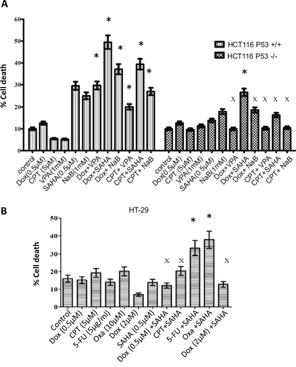 Figure 2: Combined treatment with distinct HDAC inhibitors and DNA damaging agents induces different levels of sensitivity in CRC cells. A. HCT116 p53+/+, HCT116 p53-/- cells were treated with a single treatment of Dox (0.5μM) and Camptothecin-11 (CPT-11) (5μM) or combined treatment with VPA (1 mM), SAHA (0.5μM), and sodium butyrate (NaB) (1 mM) for 24 h and then cells were prepared for the cell death analysis by flow cytometry using Propidium iodide (PI) staining. We calculated the combination index (CI) according to the Chou-Talalay method using Calculsyn software (Biosoft, Cambridge, UK). Chou-Talalay method for drug combination was based on the median-effect to defined synergy and antagonism [38]. This method offered synergistic (CI < 1), and antagonistic effect (CI > 1) in drug combinations. Error bars represent ± S.E.M of three independent experiments (n=3). B. HT-29 cell death analysis by flow cytometry after 24 hours treatment with (Dox, CPT, 5FU), SAHA or their combination. Cells were harvested and stained with Propidium iodide (PI) to determine cell death using FACS analysis. * denotes a synergistic effect and X denotes an antagonistic effect. Error bars represent ± S.E.M of three independent experiments (n=3).
