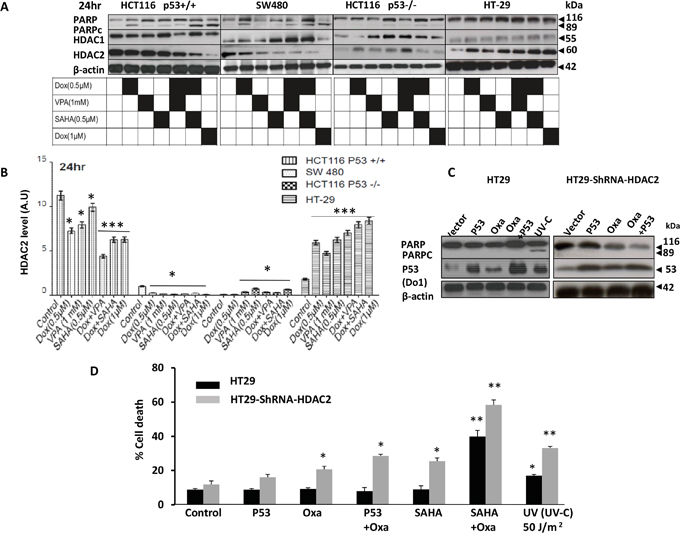 Figure 4: Characterisation of HDAC2 expression levels in distinct CRC cell lines and its relationship with P53 and resistance to HDACis combined with DNA damaging agent doxorubicin. A. HCT116 p53+/+, null p53, SW480 and HT-29 cells were treated with Dox either singly or combined with SAHA or VPA for 24 hours. Cells were lysed and the proteins separated using SDS-PAGE and detected by WB analysis. The cleavage of PARP, a hallmark of apoptosis and the protein level of HDAC1 and HDAC2 were assessed using the appropriate antibodies. Actin was used as a loading control. B. Four cell lines were treated with Dox either singly or combined with SAHA or VPA for 24 hours and cells were lysed and the proteins separated using SDS-PAGE and detected by WB analysis. HDAC2 protein levels were assessed using the appropriate antibodies and quantified using ImageJ software. C and D. P53 expression vectors were transiently transfected into HT-29 cells and HT29-ShRNA-HDAC2 cells, The cells were treated with Oxa (10μM) for 24 hours. Cells were lysed and the proteins separated using SDS-PAGE and detected by WB analysis. The PARPc and the protein level of p53 were assessed using the appropriate antibodies. Actin was used as a loading control. D) P53 transfected cells were also analyzed for cell death using PI staining and FACS analysis. Cells treated with SAHA+ Oxa or illuminated by UV-C (50 mJ/m2) were used as positive controls. Error bars represent ± S.E.M. of three independent experiments (n=3) and statistical significance is depicted by (*) for p<0.05 calculated by a two-tailed Student’s T test compared to the control group.