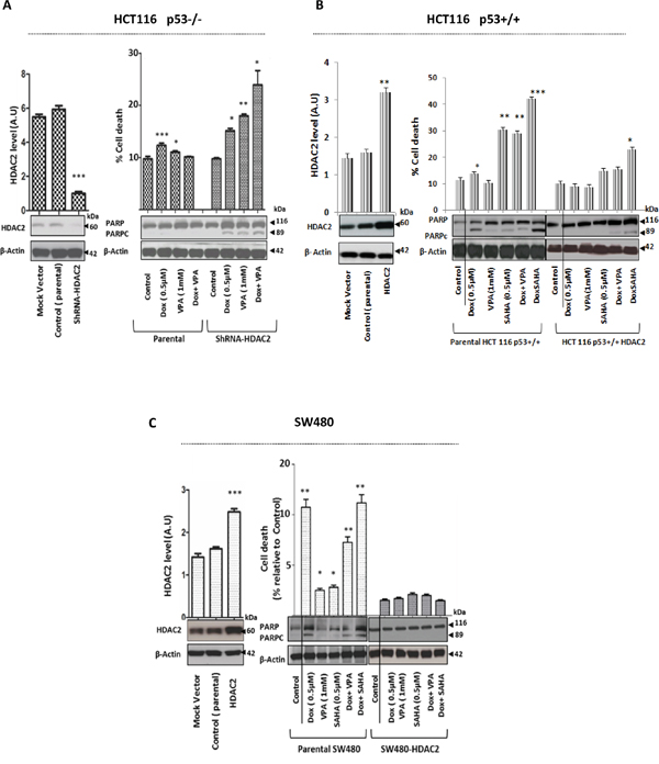 Figure 6: Modulation of HDAC2 expression level by depletion or overexpression directly influences the effect of Dox as single or combined to HDACis in CRC cells. A. Stable ShRNA-HDAC2 HCT116 p53-/- cells were generated by using lentiviral vector and HDAC2 downregulation was confirmed by WB. Actin was used a loading control. Cells were exposed for 24hr to Dox as single treatment or combined with VPA. Protein cell lysates were separated by SDS-PAGE and detected by WB analysis. The PARPc protein level was assessed using the appropriate antibodies. Actin was used as a loading control. Cells were also harvested and stained by PI to determine cell death using FACS analysis. Error bars represent ± S.E.M. of three independent experiments (n=3) and statistical significance is depicted by * for p<0.05 calculated by a two-tailed Student’s T test compared to the control group. B and C. HCT16 p53+/+ and SW480 cell lines were transfected with HDAC2 vector. After 24 hours post-transfection, cells were lysed and the proteins separated using SDS-PAGE. The overexpression of HDAC2 level was detected by WB and quantified using ImageJ densitometry software. HCT16 p53+/+ and SW480 cells transiently transfected with HDAC2 vector were treated with Dox only or combined with VPA or SAHA. After 24 hours, cells were lysed and the proteins separated using SDS-PAGE. The PARPc was analyzed by WB and cell death was quantified by FACS after PI staining. Error bars represent ± S.E.M. of three independent experiments (n=3) and statistical significance is depicted by * for p<0.05 calculated by a two-tailed Student’s T test compared to the control group.