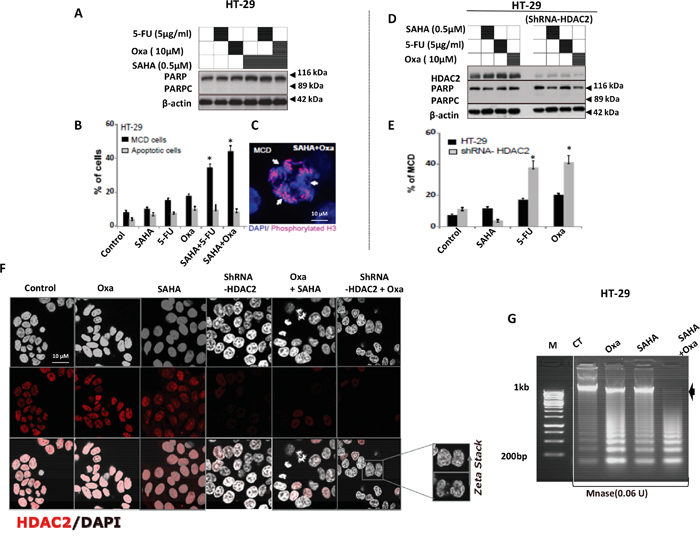 To investigate the role of HDAC2 in MCD, shRNA-mediated knockdown of HDAC2 was achieved in HT-29 cells. These were then treated with 5-FU, Oxa and SAHA and compared to their parental cells following measurement of both PARPc and MCD (Figure 7D and 7E). HDAC2 knockdown was sufficient to sensitise HT-29 cells to 5-FU or Oxa treatment and only the combined treatments were able to reduce HDAC2 expression as detected by immunohistochemistry similar to HDAC2 knockdown effect (Figure 7F). We noticed that the combined treatment Oxa/SAHA induced chromatin relaxation as assessed by micrococcal nuclease (MNase) assay (Figure 7G). Oxa combined with shRNA-HDAC2 disturbed the higher order chromatin structure in a similar manner to the Oxa combination with SAHA (Figure 7F, Zeta Stack).
