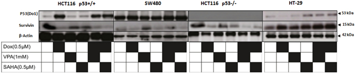 Figure 9: Dox/SAHA combination decreases drastically survivin protein level in HCT 116 p53+/+, HCT116 p53-/- and SW480 but not HT-29 cell lines. Four cell lines (HCT 116 p53+/+, HCT116 p53-/- SW480 and HT-29) were treated with Dox, VPA, SAHA or different combinations of these drugs for 24hours. Cells were lysed and the proteins separated using SDS-PAGE and detected by WB analysis. The protein level of Survivin and p53 were assessed using the appropriate antibodies. Actin was used as a loading control.