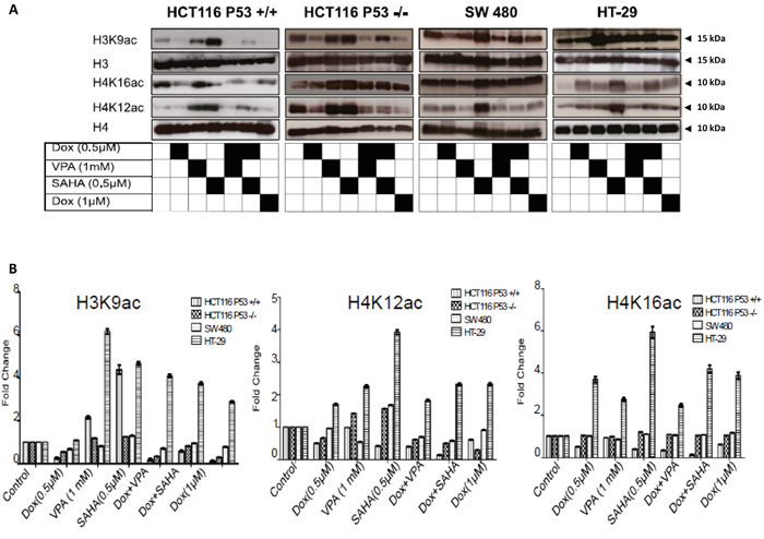To determine if there was a correlation between histone acetylation and the sensitivity of CRC cell lines to combined treatment. The levels of histone acetylation in HCT116 p53+/+, HCT116 p53-/- (poorly differentiated) and SW480 (poorly differentiated and invasive) were compared to the well-differentiated CRC cell line HT-29. All cell lines were exposed to Dox, VPA, and SAHA as a single or combined treatment and the changes in histone acetylation established. Dox (1μM) induced significant cell death in HCT116 p53+/+, SW480, HCT116 p53-/- and with no effect on HT-29. Therefore, the effect of combined treatment on histone acetylation was compared using this concentration. Interestingly, Dox combined with SAHA or VPA triggered a decrease in histone acetylation in the poorly differentiated and sensitive CRC cells, but not in the resistant and well-differentiated HT-29 cells. In HT-29 cells, the H3K9ac, H4K12ac and H4K16ac levels remained high after the combined treatments compared to the other cell lines (Figure 10).