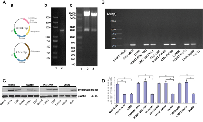 Figure 1: hTERT-driven expression of the tyrosinase system is functional in hTERT-positive cells. A. Construction of a reconstructed tyrosinase expression plasmid driven by the hTERT or CMV promoter. a. Schematic diagram of the constructed plasmid. b. TYR DNA was amplified by PCR with primers ranking the TYR open reading frame. c. phTERT/TYR-IRES2-EGFP (lane 2) and pCMV/TYR-IRES2-EGFP plasmids (lane 3) were digested with both EcoR I and Sal I. B and C. PCR and Western blot were used to detect expression of tyrosinase in various cell lines. Three hTERT-positive cell lines (HepG2, SGC-7901 and SW480) and one hTERT-negative cell line (U2OS) were infected with hTERT-TYR and CMV-TYR, respectively. Then, PCR and Western blot were used to assay the expression of tyrosinase mRNA (B) and protein (C). D. Tyrosinase activity in the four cell lines described above was assessed using the method described in Korner et al (30) and read out as the absorbance at 490 nm.
