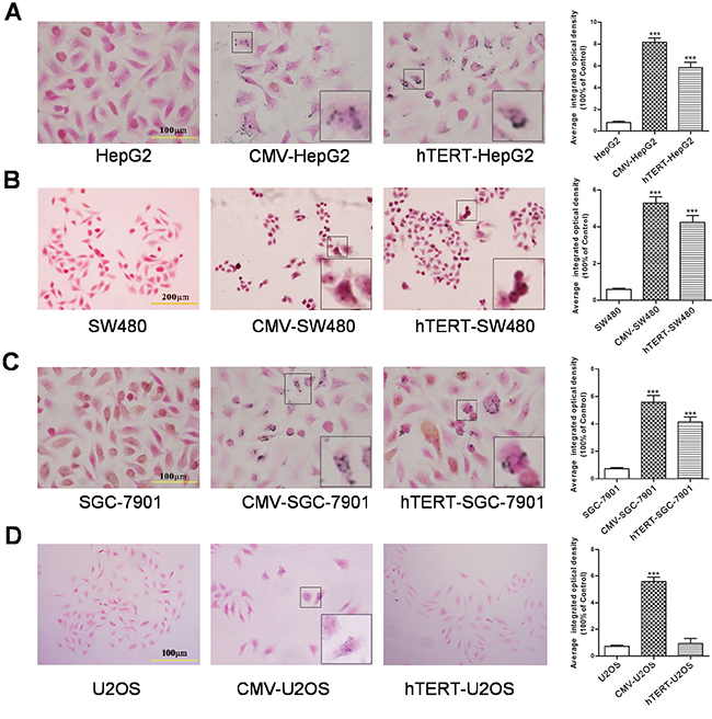 Figure 2: hTERT-TYR selectively promotes melanin production in hTERT-positive tumor cells. U2OS, HepG2, SGC7901 and SW480 cells infected with hTERT-TYR or CMV-TYR were seeded into six-well plates at a density of 1×105 per well. Seventy-two hours later, cells were harvested for Fontana staining to analyze the production of melanin. Uninfected cells were used as a control. Fontana staining of A. HepG2 cells, B. SW480 cells, C. SGC-7901 cells and D. U2OS cells.