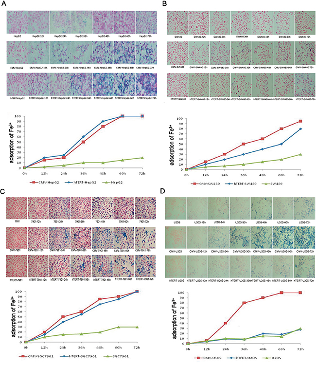 Figure 3: hTERT-TYR selectively promotes adsorption of ferric ions in hTERT-positive cells. U2OS, HepG2, SGC7901 and SW480 cells infected with hTERT-TYR or CMV-TYR were seeded into 24-well plates at a density of 1×104 per well. Subsequently, the cells were incubated with 5 mg/μl iron ions for various lengths of time and then subjected to Prussian blue staining to assay the adsorption of the ferric ions in different cells. Uninfected cells were used as a control. A-D. Prussian blue staining and corresponding quantitation results of the four cell lines.
