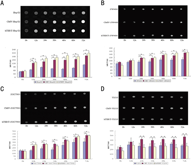 Ferric ions show a specific, high signal at MR T1WI that is positively associated with the level of ferric ions. As shown in Figure 4A-4D, in the hTERT-TYR group, the signal at MR T1WI increased in a time-dependent manner in hTERT-positive cells (especially HepG2 cells and SGC-7901) but not U2OS cells. However, the MR T1WI signal of all the CMV-TYR cells increased. These results suggest that MR scanning based on the hTERT-driven tyrosinase system can specifically identify cells with high hTERT expression.
