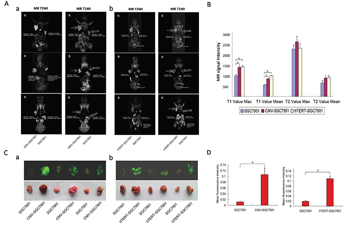 SCID mice injected with various types of cells were subjected to MR scanning. As shown in Figure 5A, the CMV-SGC-7901 group (Figure 5Aa) showed a higher signal at MR T1WI compared to the control, and similar results were obtained in the hTERT-SGC-7901 group (Figure 5Ab). However, MR T2WI scanning did not show differences in the signal levels between the groups (Figure 5A). An in vivo Multispectral Imaging System was used to image GFP expression in the mice, and the tumors were also harvested and imaged separately. The maximums and averages of the signal strengths at MR T1WI and MR T2WI were calculated and are shown in Figure 5B. This result further demonstrates that MR T1WI but not MR T2WI reflects the signal change caused by the reporter lentivirus in cells with varying levels of hTERT expression. As shown in Figure 5C, both the CMV-SGC-7901 group and the hTERT-SGC-7901 group had higher green fluorescence signals than the control group, which was consistent with the results in Figure 5A. The results shown in Figure 5C are quantified in Figure 5D. Quite consistent results were observed in xenograft tumors derived from HepG2 cells (Supplementary Figure 1). On the contrary, the MR T1WI signal was unchanged in the hTERT-U2OS group compared with the corresponding control group (U2OS; Supplementary Figure 2). These results imply that MR T1WI can be used to distinguish hTERT-positive tumors from the hTERT-negative tumors using the hTERT-TYR system.