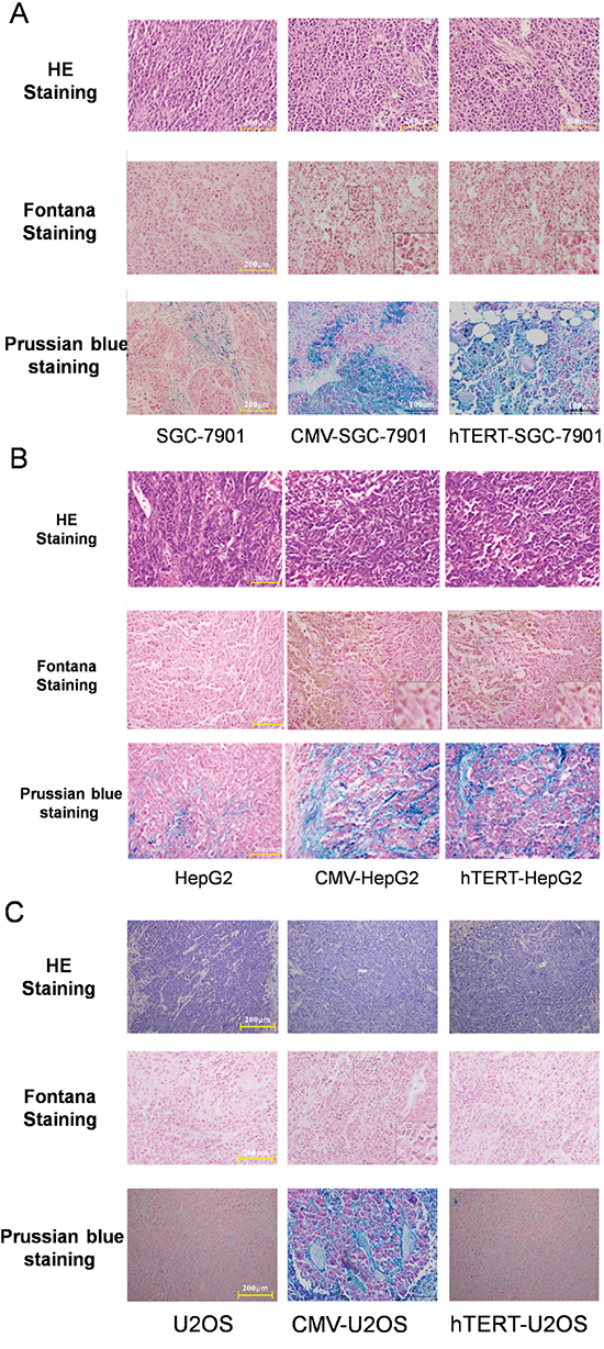 Figure 6: Melanin production and adsorption of ferric ions in xenograft tumors derived from various types of cells. A. SGC-7901 cells. B. HepG2 cells. C. U2OS cells.