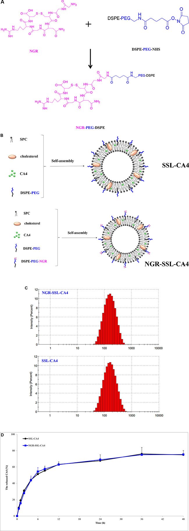 The synthesis of NGR-PEG-DSPE and the preparation of NGR-SSL-CA4 are shown in Figure 1A and 1B.