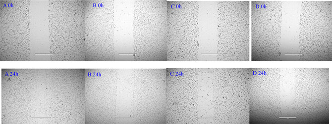 Figure 3: Blocking effect of NGR-SSL-CA4 on wound-healing in U87-MG cells. (A) control; (B) free CA4; (C) SSL-CA4; (D) NGR-SSL-CA4.
