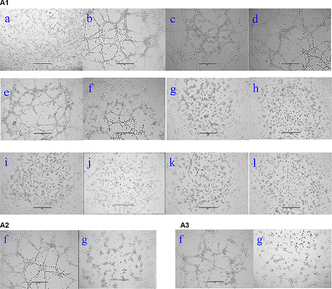 Figure 4: Destructive effect of NGR-SSL-CA4 on U87-MG cell VM channels in vitro. (A1) free CA4; (A2) SSL-CA4; (A3) NGR-SSL-CA4. a, cells without matrigel and drug; b, control (0 nM); c, 1 nM; d, 2 nM; e, 4 nM; f, 10 nM; g, 20 nM; h, 40 nM; i, 50 nM; j, 80 nM; k, 100 nM; l, 200 nM. Images were obtained under an EVOSR microscope with a × 10 objective.