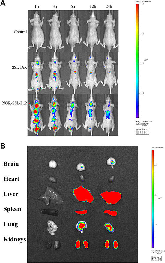 The U87-MG orthotopic glioma model was established by injection of U87-MG cells (5 × 105 cells/3 μl of PBS (pH7.4)) into the right brain of each nude mouse (2 mm laterally to the bregma and 3.0 mm deep from the dura) using a stereotaxic apparatus [34]. On the 10th day, the mice were given a tail vein injection of 5% glucose injection, SSL-DiR and NGR-SSL-DiR. In vivo fluorescence imaging was performed using an IVIS SPECTRUM in vivo imaging system (Xenogen, USA) at different times (1, 3, 6, 12 and 24 h). The mice were sacrificed at 24 h and brain, heart, liver, spleen, lung, and kidneys were collected immediately. The fluorescence intensities in the different tissues were photographically recorded.