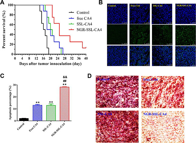 The effect of tumor cell apoptosis was investigated by TUNEL analysis staining of tumor tissue sections. As shown in Figure 7B, tumors from the NGR-SSL-CA4-treated group exhibited more advanced cell apoptosis compared with the groups treated with 5% glucose injection, free CA4 and SSL-CA4. The calculated results are shown in Figure 7C.