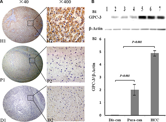 Figure 1: GPC-3 expression and cellular distribution between HCC and noncancerous tissues. (A) the expression of hepatic GPC-3 was analyzed on tissue microarrays by immunohistochemistry with the primary mouse anti-human GPC-3 antibodies. The positive GPC-3 expression with brown staining particles was distributed in the cytosol or membrane of hepatocytes or only a few cell nuclei. H1 and H2, the stronger straining of GPC-3 expression in the HCC tissues; P1 and P2, the light straining of GPC-3 expression in the matched surrounding tissues; and D1 and D2, the distal cancerous tissues without any positive staining. H1, P1 and D1 original magnification × 40, and H2, P2 and D2 original magnification × 400; (B) the analysis of hepatic GPC-3 expression by Western blotting (B1), and the ratio of hepatic GPC-3 to β-actin (B2) with lane 1 from the distal cancerous tissues; lane 2, 3, and 4 from the paracancerous; and lane 5, 6, and 7 from the HCC tissues. GPC-3: glypican-3; H1, H2 or HCC, hepatocellular carcinoma tissues; P1, P2 or Para-can, para-cancerous tissues; and D1, D2 or Dis-can, distal cancerous tissues.