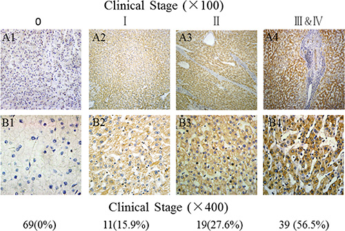 Figure 2: Comparative analysis of GPC-3 expression in HCC tissues at different stages. A1 and B1, the low or without GPC-3 expression in the para-cancerous tissues, and A2~A4 and B2~B4, the brown staining of GPC-3 expression with gradually increasing from stage I, II to III~IV of HCC tissues; Original magnification × 100 from Figure 2 A1 to Figure 2 A4 or × 400 from Figure 2 B1 to Figure 2 B4); HCC, hepatocellular carcinoma; GPC-3: glypican-3.