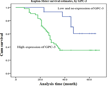Figure 3: Overall survival curves of 69 patients with HCC. GPC-3 expression curves were calculated according to the Kaplan-Meier method. The accumulative survival curves of 69 patients with HCC were made according to HCC tissue expressing low or higher GPC-3 level (log-rank test, P < 0.001). The green line is the higher GPC-3 group; and the blue line is the lower or without GPC-3 group. HCC, hepatocellular carcinoma; GPC-3: glypican-3.