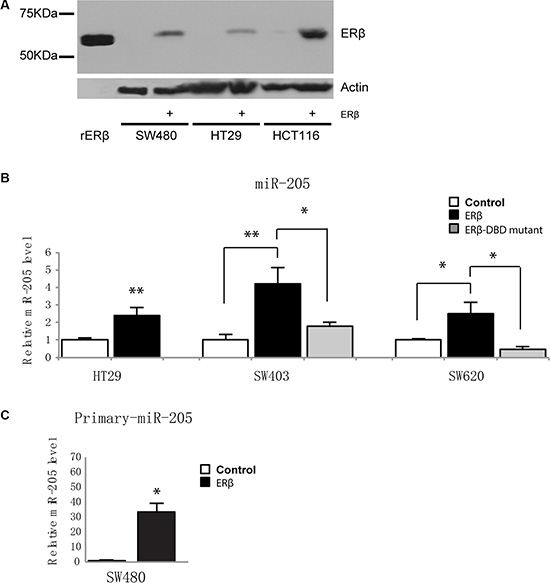 Figure 2: ERβ upregulates miR-205 expression in colon cancer cells. (A) Western blotting demonstrates FLAG-tagged ERβ protein levels after lentivirus-mediated transduction in SW480, HT29, and HCT116 cells, compared to non-detectable levels in control cells. Recombinant ERβ (59 kDa) was used as positive control (left lane), and β-actin as loading control. (B) Mature miR-205 expression is upregulated by ERβ and is dependent on its DNA-binding domain. SW403 and SW620 were transiently transfected by 500 ng pcDNA3.1, ERβ or ERβ-mDBD, and expression determined using miRNA qPCR and normalized to U6 snRNA 48 h after transfection. Transfection and subsequent analysis were replicated three times. (C) ERβ regulates primary miR-205 in SW480 cells. Expression normalized to 18S. (*P < 0.05, **P < 0.01, Student’s t-test).