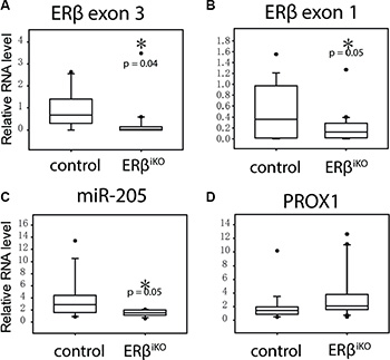Figure 4: Intestinal-specific KO of ERβ results in decreased miR-205 in colon epithelial cells. Colon scraping samples were collected from wild-type mice (N = 15) and ERβiKO (N = 16) and RNA expression was analyzed by qPCR. (*P < 0.05, Student’s t-test). Supplementary Table S1 shows the corresponding correlation between ERβ, miR-205, and PROX1 expression.