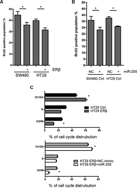 Figure 5: Both ERβ and miR-205 block cell proliferation. (A) Cell proliferation is inhibited by ERβ expression in SW480 and HT29 cells. BrdU measurment was performed 60 min after BrdU was added to cells engineered to express ERβ and corresponding controls. (B) Cell proliferation is repressed by miR-205 transfection. SW480 and HT29 cells were transfected by miR-205 mimic or scrambled control (50 nM, single transfection), followed by BrdU measurment 48 h after transfection. (C) Distribution of cell cycle is similarly affected by ERβ and miR-205 overexpression in colon cancer cell lines. Flow cytometry was performed after propidium iodide (PI) staining to assess cell cycle distribution. All experiments were replicated three times. NC: scrambled negative control. (*P < 0.05 compared to control, Student’s t-test).