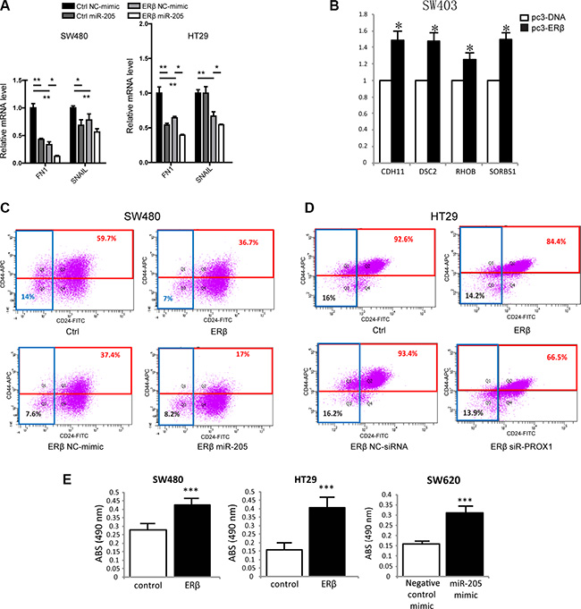 Figure 6: ERβ and miR-205 affects EMT, stemness and cell adhesion in colon cancer. (A) EMT markers and PROX1-regulated genes FN1 and SNAIL are regulated by both ERβ and miR-205 in SW480 and HT29 cells. mRNA levels were analyzed 48 h after miR-205 double transfection, and experiments were replicated two times. (B) Cell adhesion genes are regulated by ERβ in SW403 cells. mRNA levels were analyzed 72 h after ERβ transfection, and experiments were replicated three times. (C–D) Colon cancer stemness is affected by ERβ, miR-205, and PROX1 in SW480 and/or HT29 cells. Cells were analyzed 48 h after single miR-205 mimic and siR-PROX1 transfection, and experiments were replicated two times. (E) ERβ and miR-205 regulate cellular adhesion in several colon cancer cell lines. Cell adhesion assay was performed 72 h after ERβ or miR-205 mimic transfection, and all experiments were replicated three times. Absorbance (Abs) indicates the relative amount of cells that attach to the collagen surface, and is a measure of adhesion. NC: scrambled negative control mimic. (*P < 0.05, **P < 0.01, ***P < 0.001, Student’s t-test).