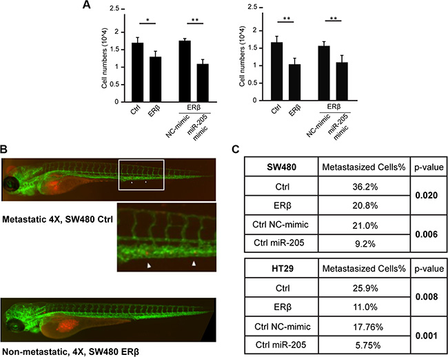 Figure 7: ERβ and miR-205 inhibits tumor invasion in vitro and in vivo. (A) Cell invasiveness is reduced by ERβ and miR-205. SW480 and HT29 cells were transfected and transwell assay performed. After 24 h starvation of cells, 10% FBS was used as chemoattractant at the bottom of the chamber. Cells were allowed to migrate for 12 h prior to staining and quantification. (*P < 0.05, **P < 0.01, Student’s t-test) (B–C) In vivo metastasis assay. Labeled SW480 and HT29 cells, with and without ERβ expression, or with and without transfection of miR-205 mimic, were injected into transgenic Tg(kdrl:EGFP)mitfab692 zebrafish larvae in three independent experiments and observed for metastatic potential after 24 and 48 hpi. Both ERβ and miR-205 exhibited a significant (p < 0.05) anti-metastatic potential in both cell lines.