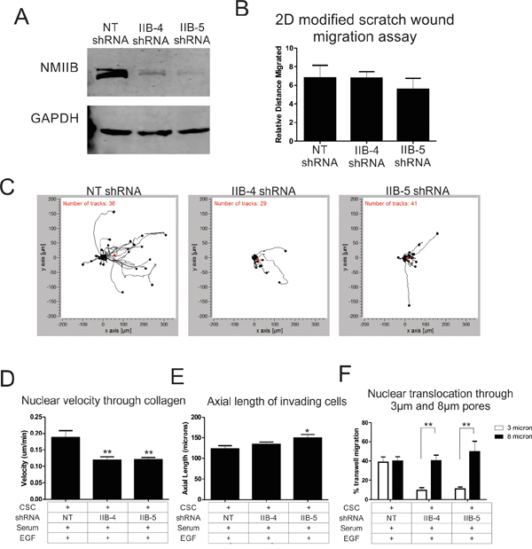 Figure 3: NMIIB is critical for enhanced motility of cancer stem cells. A. Western blot of MDA-MB 231 cells infected with the NANOG-GFP reporter lentivirus was subsequently infected with lentivirus expressing a non-targeting (NT) control shRNA construct or two different NMIIB shRNA constructs. B. 2D migration rates were analyzed by PDMS peel comparing NT control shRNA to NMIIB shRNA cells. C. Individual cell tracks of CSCs were plotted for NT shRNA or NMIIB shRNA constructs as the cells invade through a collagen gel along an EGF gradient. EGF gradient source was to the right. D. The average nuclear velocity was quantified as cells invaded through collagen along an EGF gradient for 16 hours. CSCs are indicated with a “+” and non-SCCs are indicated with a “-“. E. The axial length of cells was quantified by measuring the length of the longest cellular protrusion at the 12 hour time point of collagen invasion. F. Nuclear translocation was analyzed by measuring the percent of nuclei that migrated through 3 micron (white bars) or 8 micron (black bars) size pores of a transwell membrane. (* = P < 0.05, ** = P < 0.01)