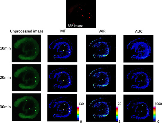 Figure 3: Unprocessed images and kinetic maps (MF, WIR, and AUC maps) using 5 μM gGlu-HMRG, and RFP image (the standard of reference for cancer location). The detection of cancer foci was a little easier on MF and AUC maps compared to unprocessed images.